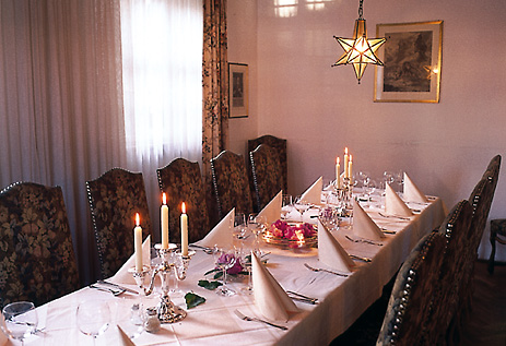 Die angenehme Atmosphäre und die geschmackvolle elegante Bestuhlung mit Gobelinpolstern sorgen auch zwischen den Gängen bei bis zu 35 Personen für bequemes Sitzen.